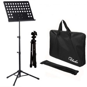 Nos encontramos con un soporte realizado en metal y que es muy resistente a la presión, consiguiendo que sea, además de resistente muy práctico y poco pesado, con un trípode que es capaz de aguantar bastante peso, por si quieres colgar algo en este atril. La altura es ajustable en tres tramos, para que puedas colocarlo a la altura que prefieras, pero lo mejor de todo es que podrás guardarlo todo en una bolsa de transporte, ocupando muy poco espacio y con un peso que te sorprenderá puesto que apenas pesará y que cuenta con un tacto antideslizante para que las hojas de las partituras aguanten bien. Es útil tanto para aguantar partituras de guitarra, de violín o cualquier otro instrumento musical.